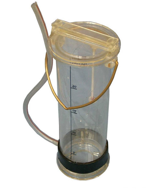 有機(jī)玻璃采水器:由桶體、帶軸的兩個半圓上蓋和活動底板、配重塊、溫度計、橡膠管、止水夾組成。